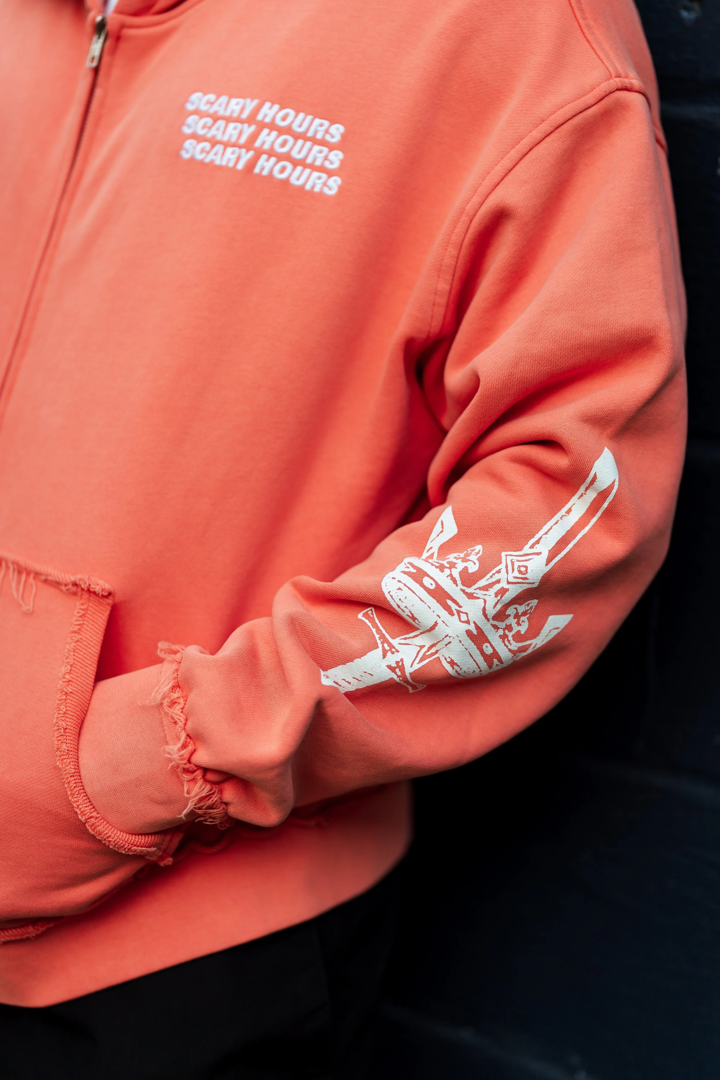 450 GSM heavyweight cotton fleece. Garment washed & distressed finished. Screen print + embroidery. Full zip construction.